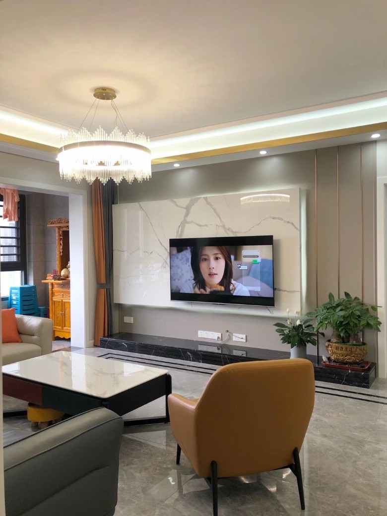 软装灵感:整体空间以暖调黑白灰为主,在软饰上选取芒草黄跳色,清新明快,金色赋予空间优雅轻奢的质感。家私上以皮革、布艺、绒面为主,温暖舒适。家具选用大理石、木来凸显质感。