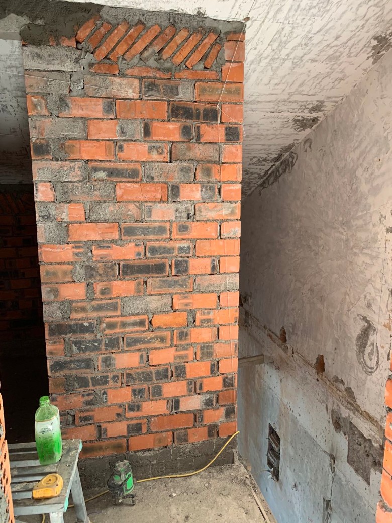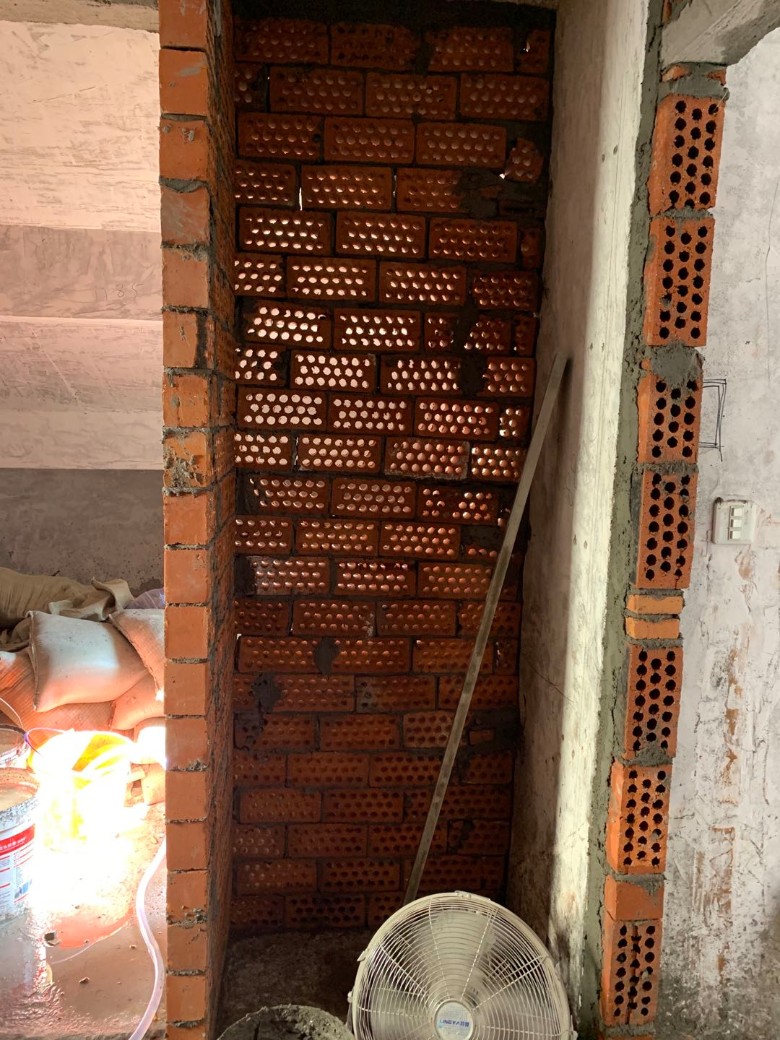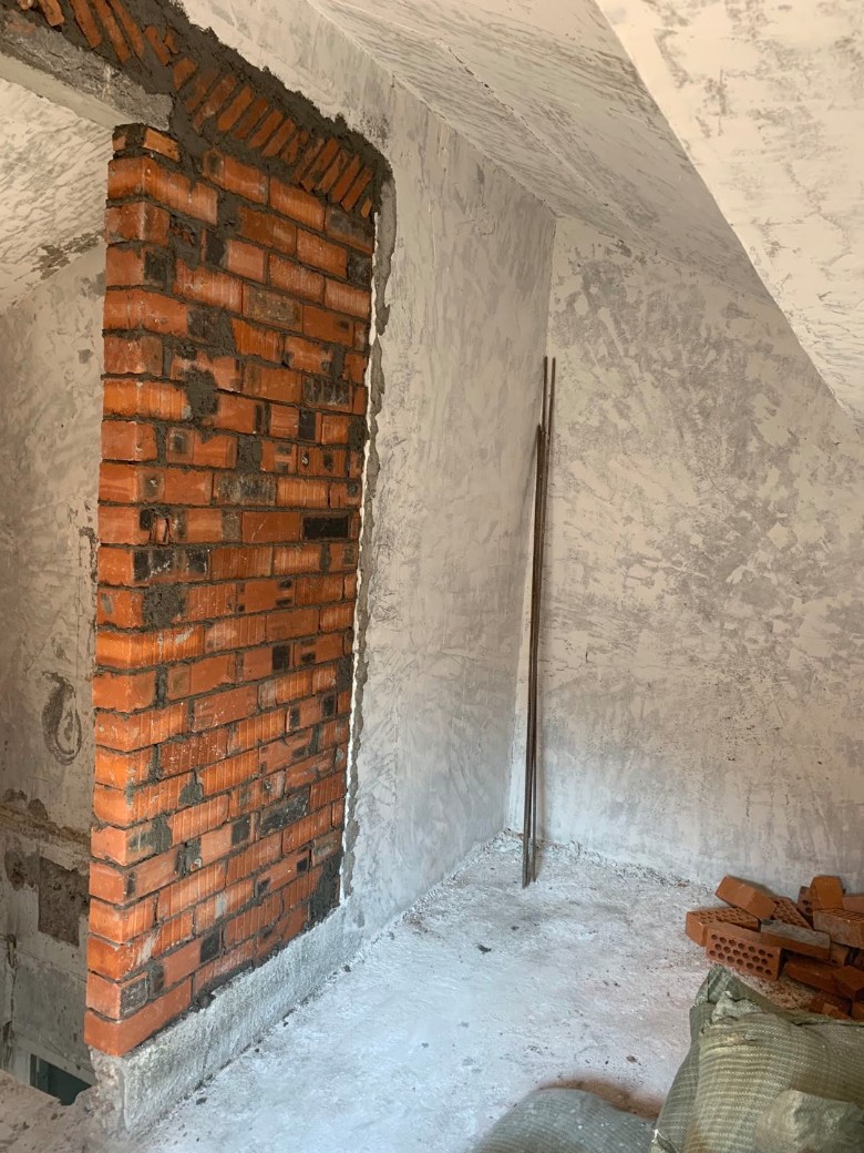 今天下午有空去看了一下工地,阁楼上一个卫生间两个房间的墙都砌完成了。这个是站在一个房间里面往外拍的,每个门头上面都用了预制水泥板做梁,1918的工艺还是很标准的,左边的是卫生间,中间过道,窗洞下面是楼梯,右边是一个干区洗手台和一个房间。