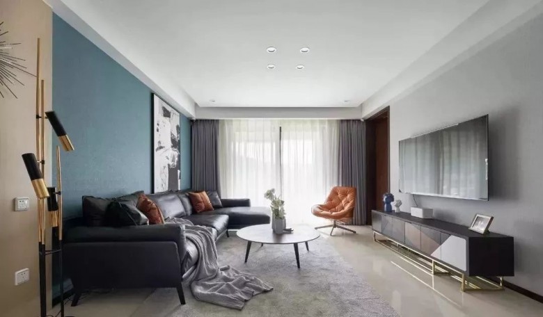沙发背景墙选用浅色的孔雀蓝和木色壁纸拼接,这种颜色搭配符合业主所向往的悠然见南山的生活,高级黑的真皮沙发搭配轻奢质感的落地灯,又像闹市里的一口烈酒,颜色的碰撞反而擦出了大隐隐于市的火花。