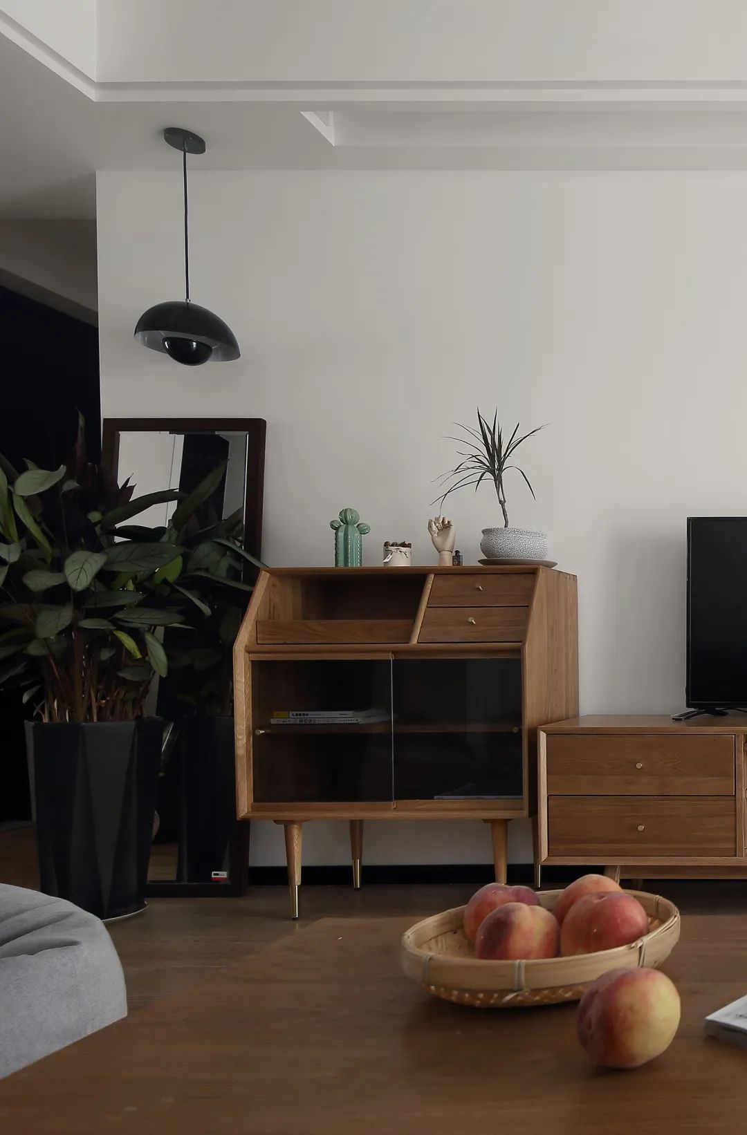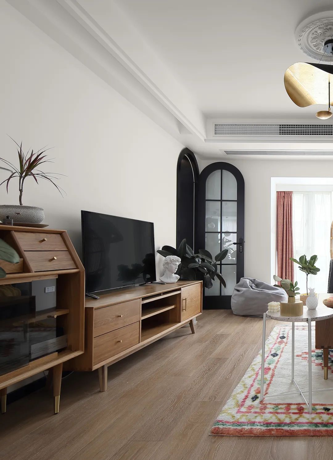 ▲电视墙布置木质电视柜与斗柜,布置绿植装饰,右边一扇黑色边框的拱形门,简洁的空间下,营造出一种小资清新的高级感。