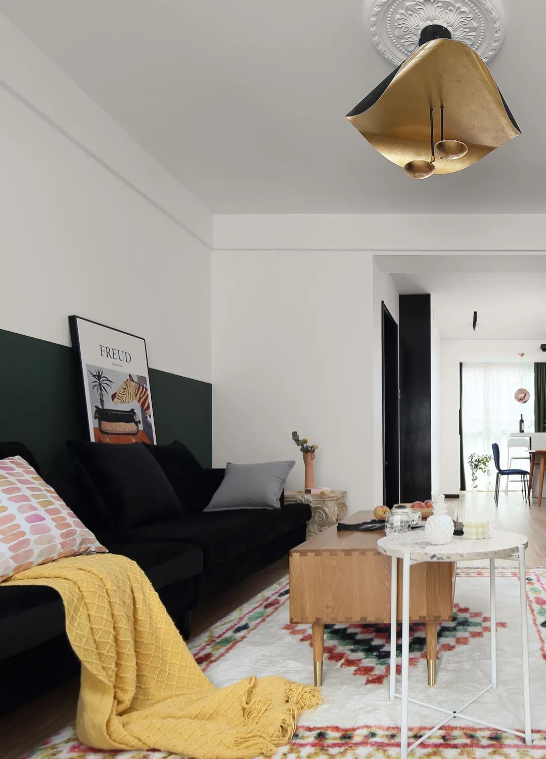 ▲沙发墙的墙脚区域采用暗绿色的墙漆,布置以黑色布艺沙发,还有鲜艳的抱枕与地毯,增加了空间的神秘气质感。