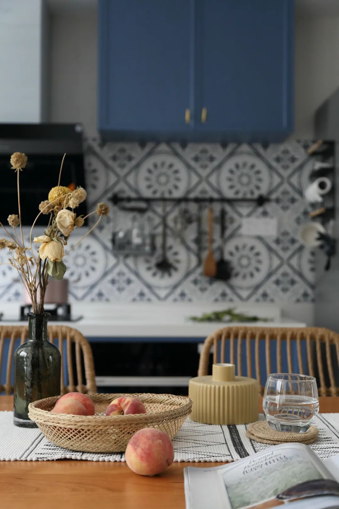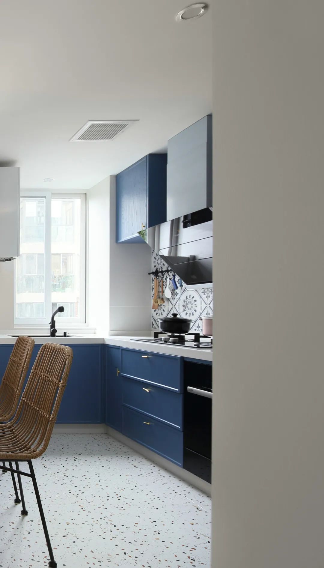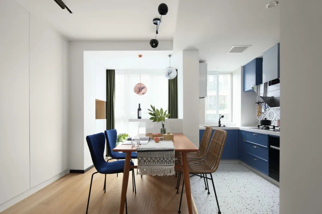 ▲开放式的厨房,以水磨石的地面与墙面砖,结合蓝色的定制橱柜,还有灶台前的花砖设计,让做饭空间显得文艺而又雅致舒适。