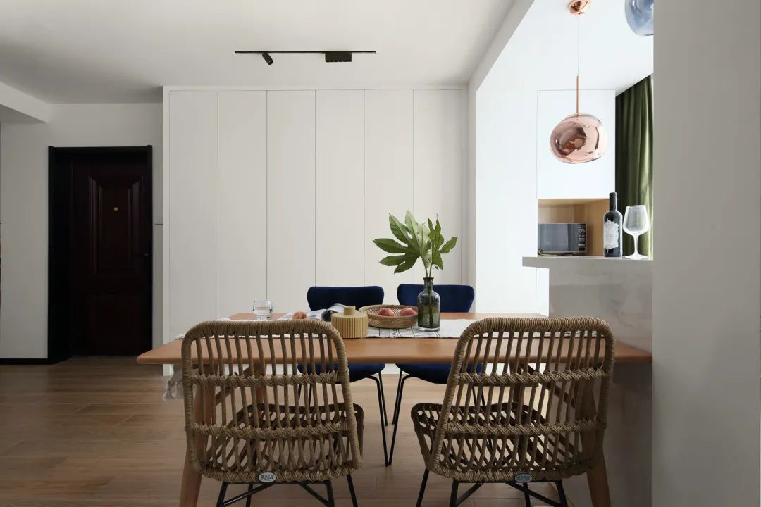 ▲餐厅简洁大方的空间,与厨房做成开放式的格局设计,布置木质餐桌,还有藤椅+布艺结合的餐椅,整体空间感显得小资舒适而情趣。