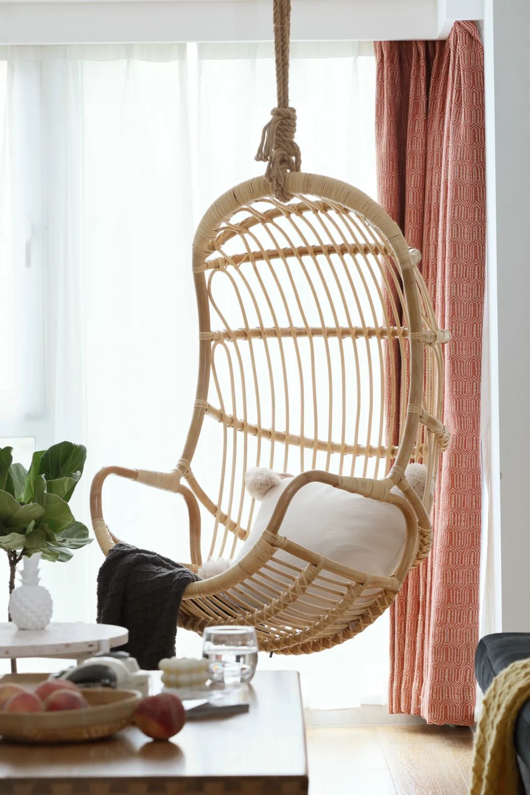 ▲靠窗位置装一个藤制的吊椅,结合粉色的窗帘,也让空间显得更加小资温馨。