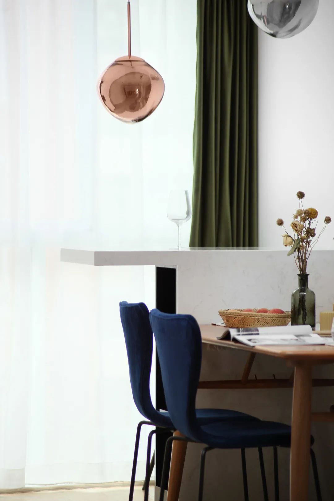 ▲餐桌挨着一张大理石材质的吧台,结合玫瑰金色的吊灯布置,也让空间显得更加优雅情趣。