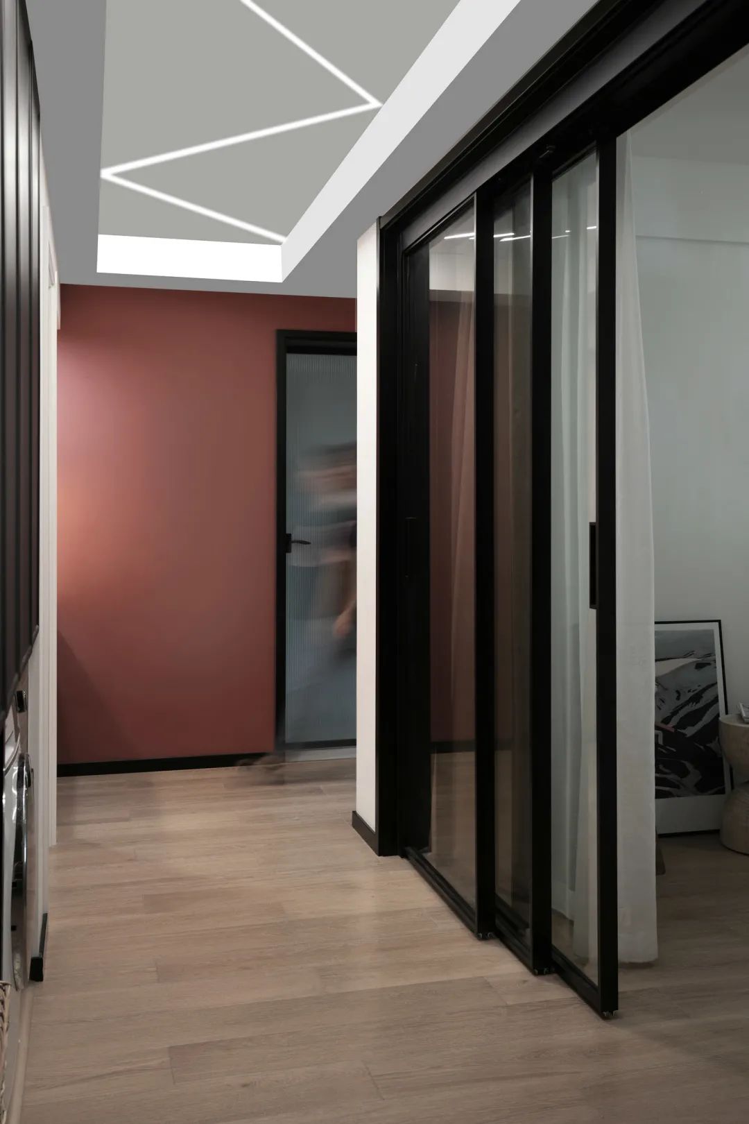 ▲走廊尽头的墙面是暗红色的,而侧边的黑框推拉门设计,结合黑色踢脚线与门框,整体空间显得更加沉稳端庄。