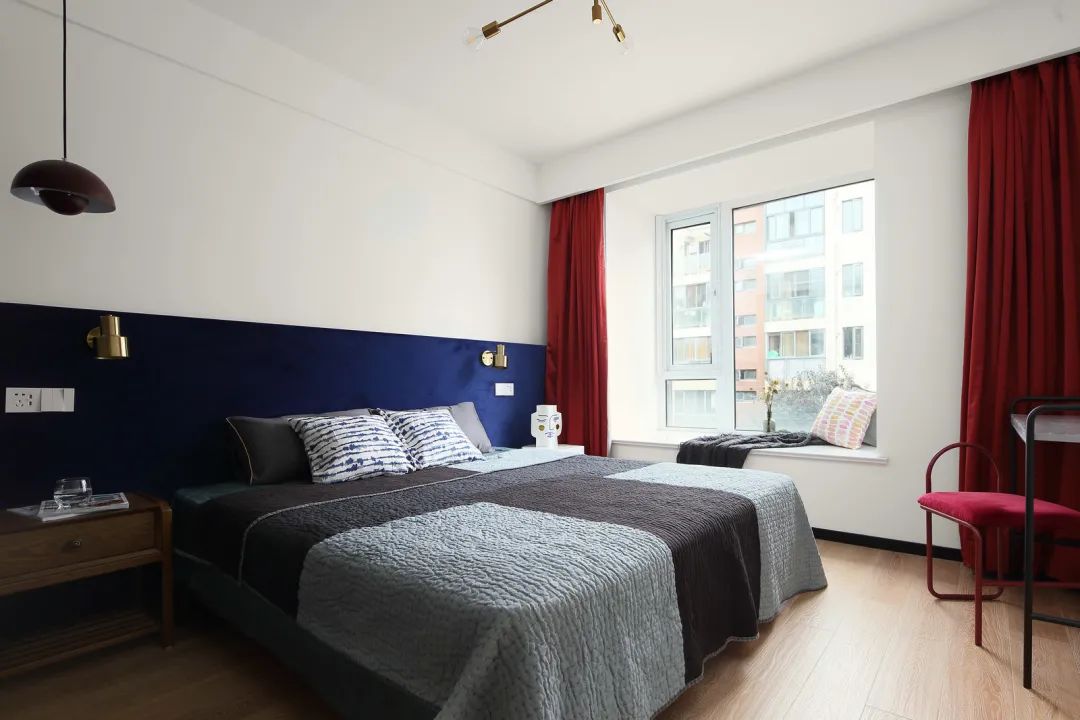 ▲主人的床头墙是深蓝色的墙脚,搭配红色的窗帘,结合简约舒适的床单,营造出一种大胆的红蓝对比色空间感。