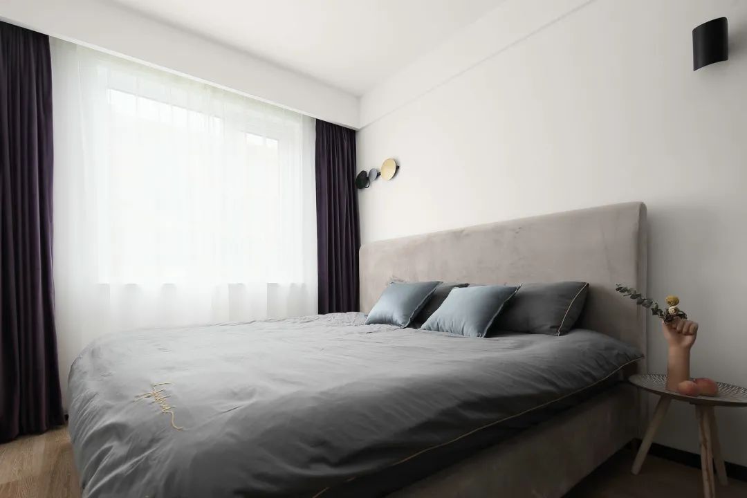 ▲次卧空间简约自然,床头墙两侧都做了不同造型的壁灯,布置以灰色布艺床与床单,整个给人的感觉就是简约年轻化,而灰紫色的窗帘,也增加了次卧空间的妖艳气质。