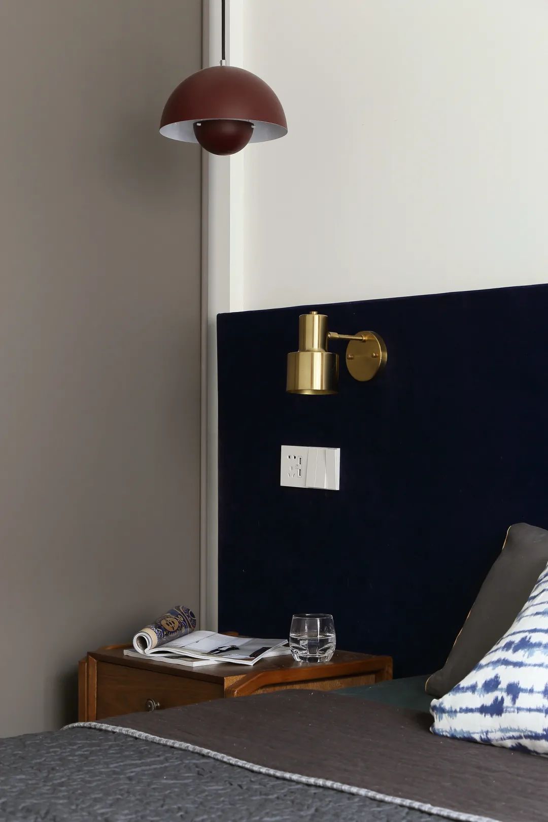 ▲床头墙上的金色壁灯,搭配木质床头柜,简洁精致的布置,也让卧室氛围更加安静舒适。