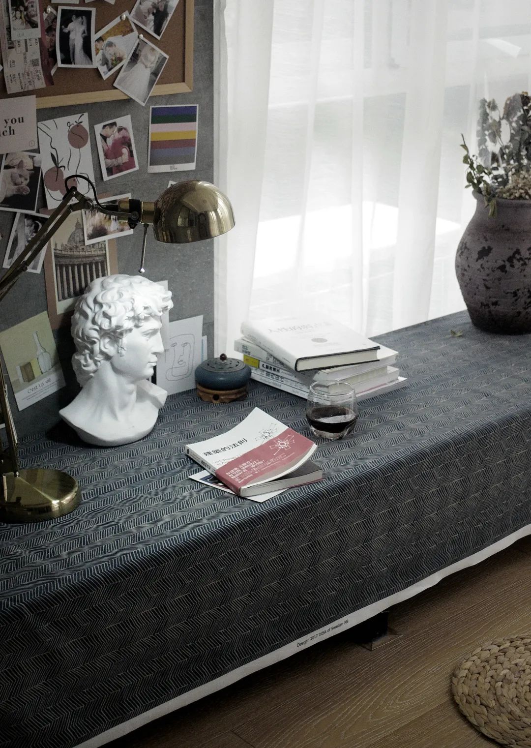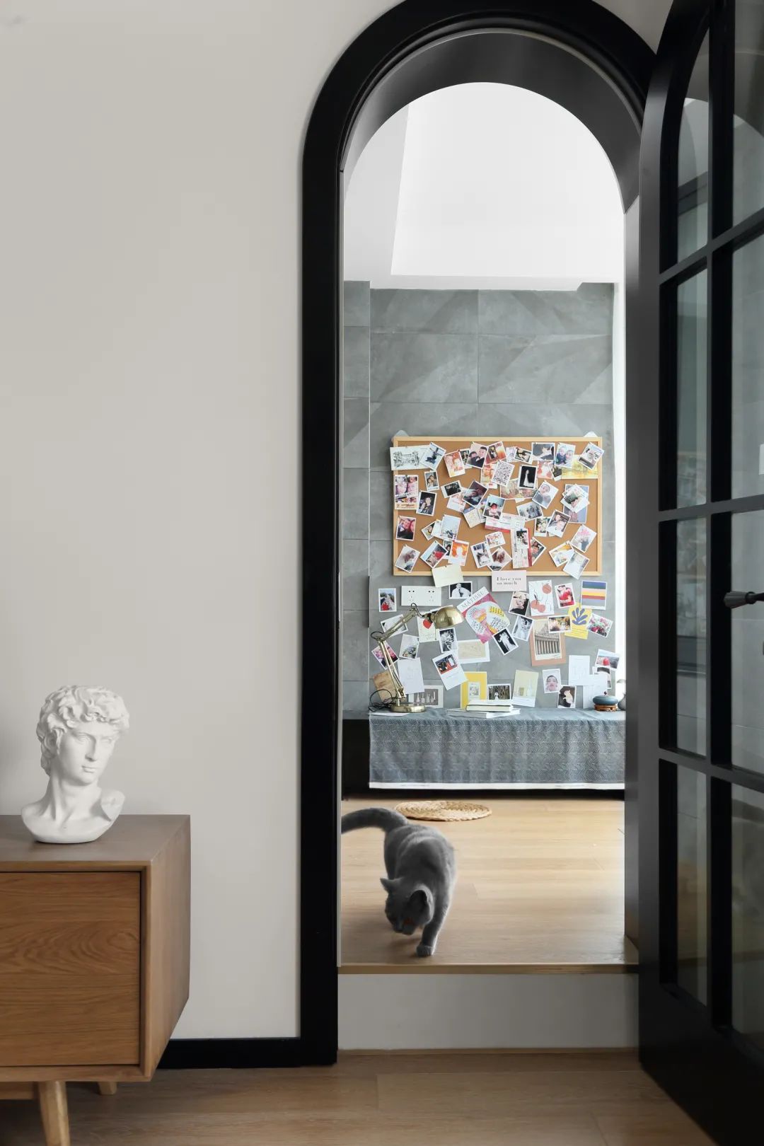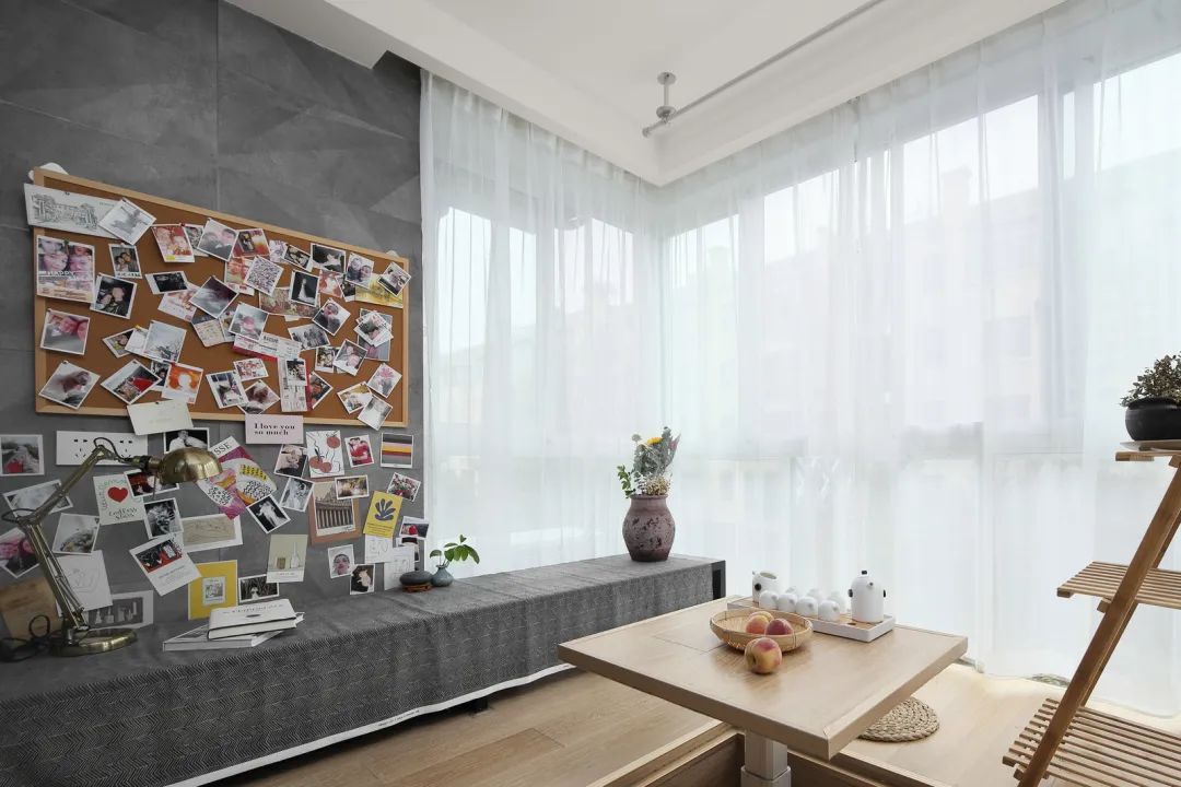 ▲灰色墙面挂一个软木板,钉上小照片什么的,也让空间显得更加活泼有趣。