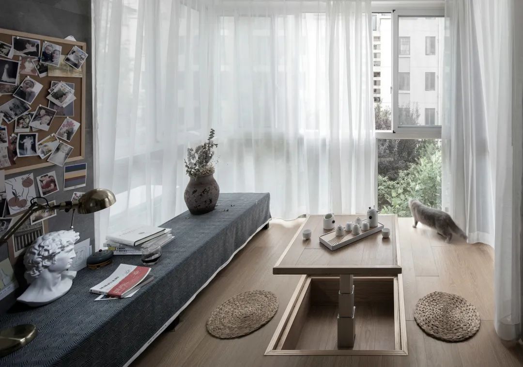 ▲阳台空间定制了一个榻榻米地台,中间装了一个升降台,后方一排飘窗设计,让这个空间成为主人休闲娱乐的多功能空间。