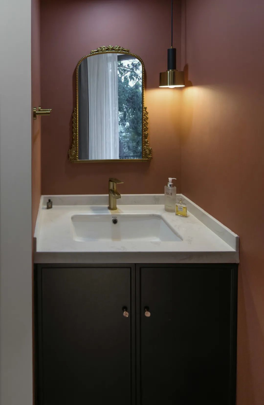 ▲卫生间的洗手盆设置在过道区域,粉红色的墙面,黑色的定制橱柜,还有复古范的金色框镜子,也让空间显得更加实用成熟。
