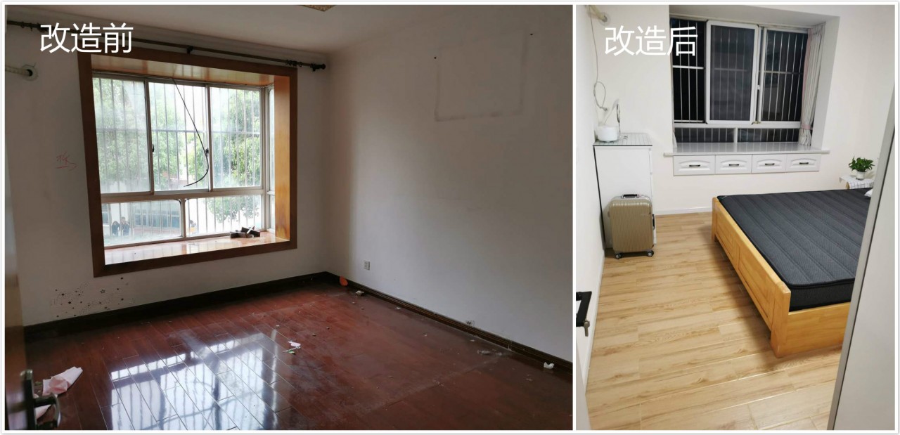 原本房间的地板颜色很深,改造后换了原木色,配上同样原木色系的床,使得整个房间氛围很舒适,非常适合休息。利用飘窗空间做了几个抽屉用来放杂物,面上用了大理石台面,方便打扫也更美观了。