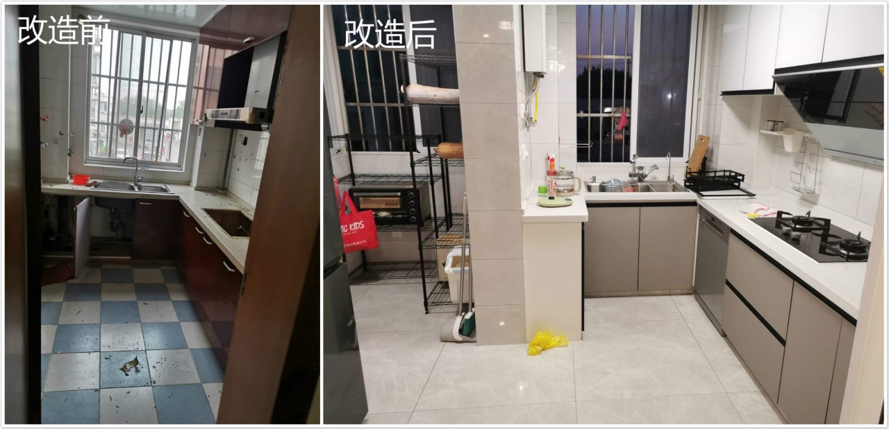 之前的厨房用的时间久了,已经堆积了大量的油污,看上去就是脏乱差。改造后的厨房,用了浅色系,非常干净清爽。开放式厨房设计,让里面的人和外面的人有了更多的交流与沟通。
