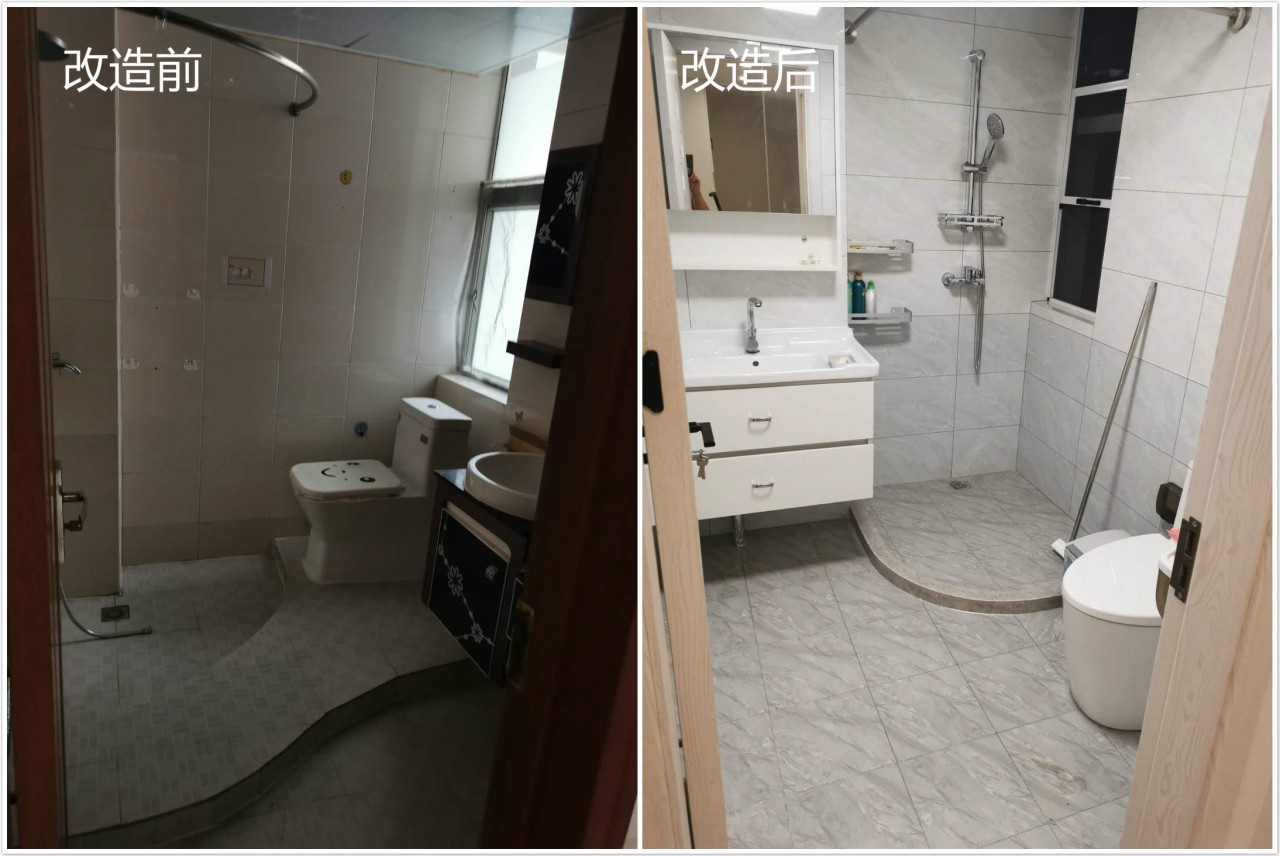 原来的洗手间地面做了一点造型,但是随着时间的迁移,现在看来已经过时,而且还存在一定的安全隐患。现在改造一下,整体风格立马不一样了,淋浴、马桶都变了位置,更符合了我们现在的生活惯。