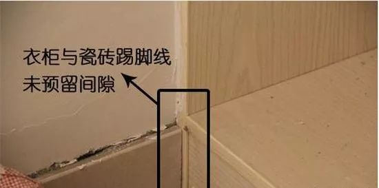 ▲衣柜与瓷砖踢脚线之间未预留空隙,也没有设置导轨就已经将地砖铺好,这会给之后安装移门造成很多不便。
