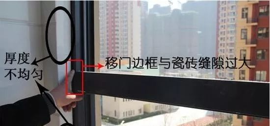 ▲阳台移门边框与瓷砖缝隙过大,且移门所处墙面的瓷砖铺贴厚度不均匀,十分不美观。