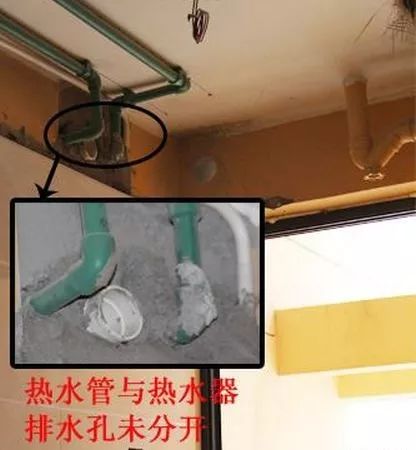 ▲厨房阳台热水管与热水器排水孔未分开,温度过高容易造成排水管热熔,产生严重后果。一般需要分开布置,保持安全距离。