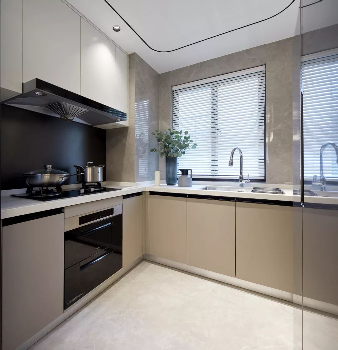 厨房的橱柜做了U字形的布局,动线设计合理也增强了储物能力。香槟色的柜门搭配浅灰色的墙地砖,整个厨房看起来温馨又舒适。