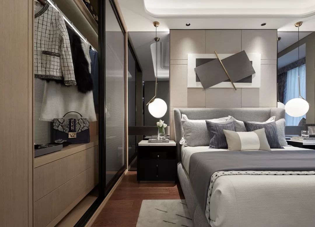 主卧室的床头背景墙做了两侧对称的茶镜设计,中间区域选择了硬包的造型,再加上床头灯和藏光的衬托,让人感觉非常帅气。