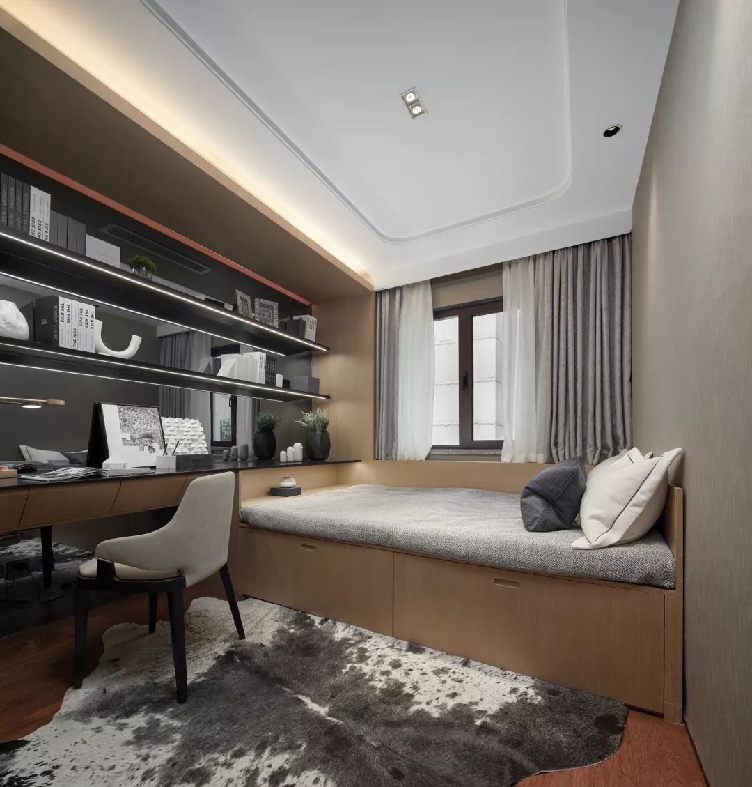 书房是被设计成了榻榻米床组合书桌的款式,在墙面用隔板来收纳,整面墙都做成黑色的茶镜,让人感觉非常的独特和有格调。