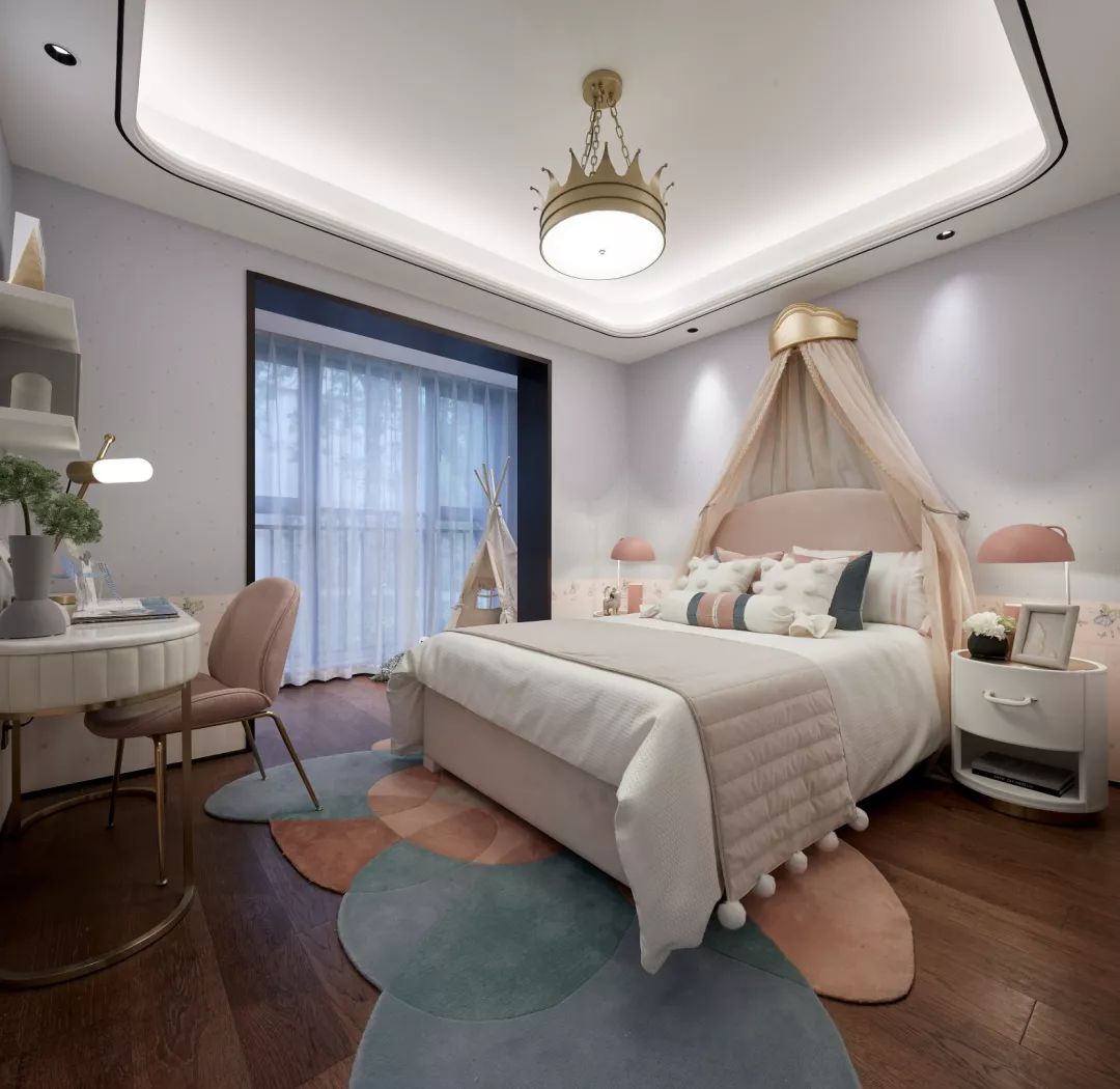 儿童房的床选择了更为可爱的公主房,整体的配色和款式都让人感觉非常优雅。顶部的吊顶四角做了弧形的设计,看起来更加柔和、舒服。