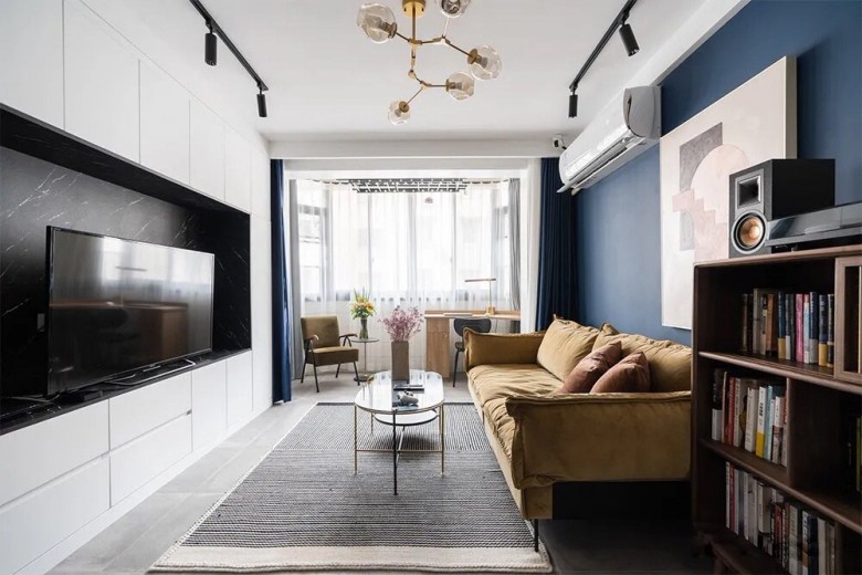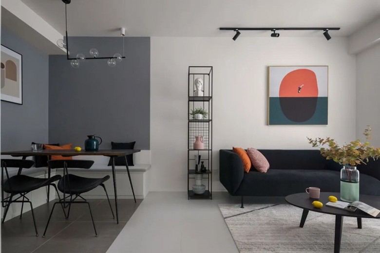 软装配色温暖质朴,颜色多用灰色,黄色,原木色,草绿色,靛蓝色。