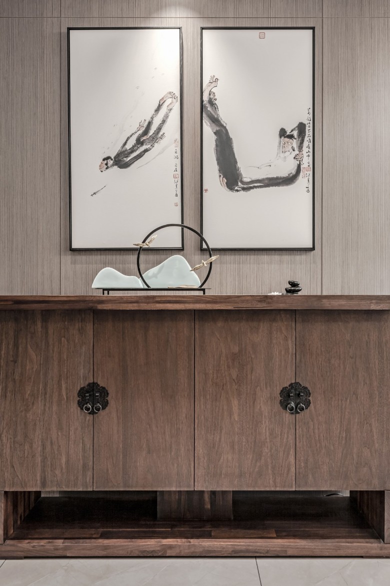 玄关紧凑而规整的线条看起来干净利落,实木的玄关柜在视觉上充实了空间,带有古典韵味的挂画也体现着些许品味。