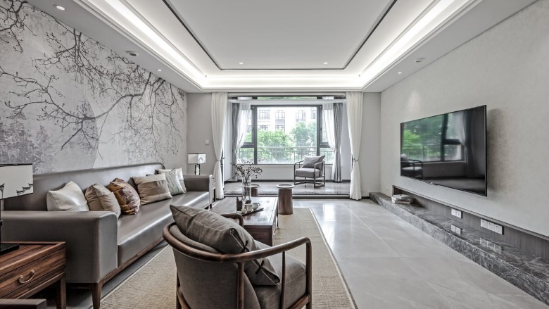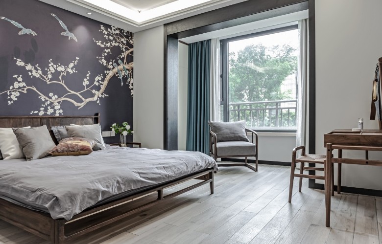 相比其他空间的设计,卧室更加简约和层次感分明,大而不空、厚而不重,即使生活在喧嚣的闹市,也有一种岁月静好的美感。灰色调为主的床上用品低调大气,搭配上简单造型的实木桌椅,与墙面的花鸟背景共同构建出怡然自得的舒适环境。▎卧室 Bedroom