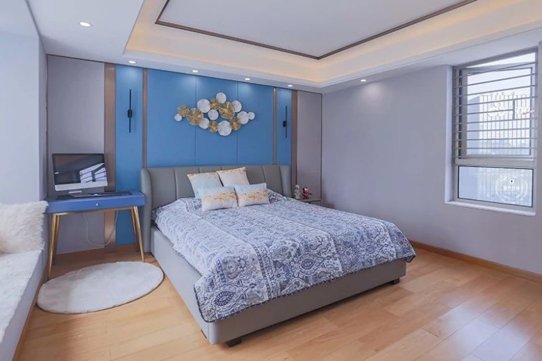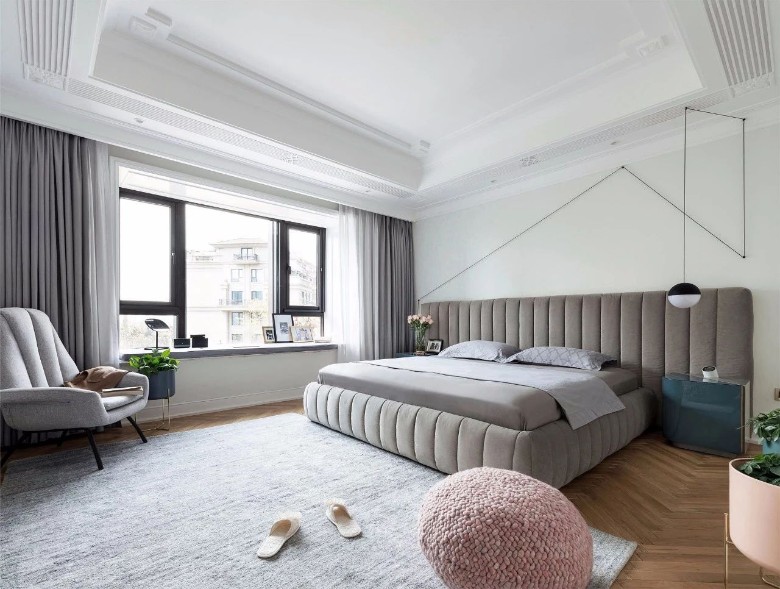 在轻奢风里,像沙发、床铺等大家具,一般是皮艺与布艺的为主,结合上第一点提到的墨绿、深蓝、驼色等组合,可以使得空间更加艳丽活泼。