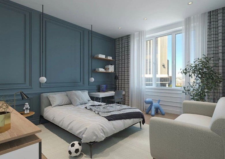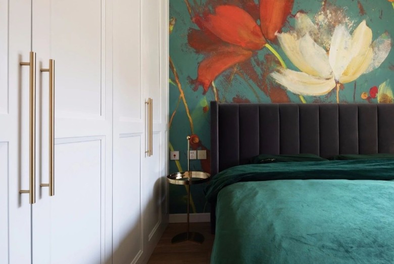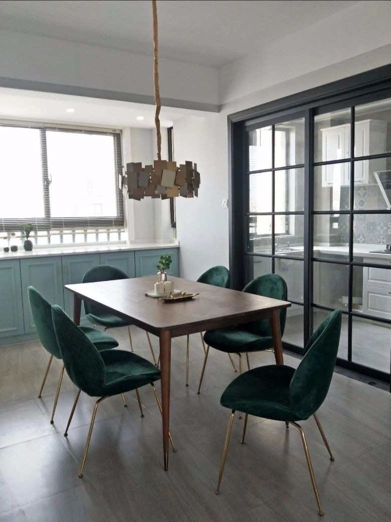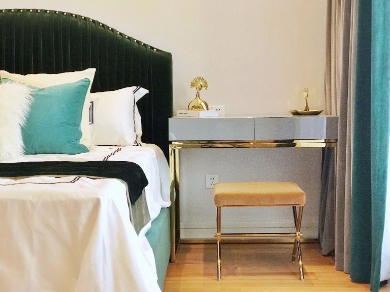 轻奢风格的颜色搭配,从墙面配色、家具配色到细节软装的配色,一般都会采纳比较大胆艳丽的色彩,比如墨绿、深蓝、驼色,这几个深而艳的色彩,在轻奢风格里面就是比较常见的搭配了。