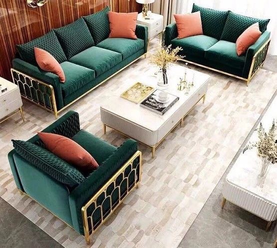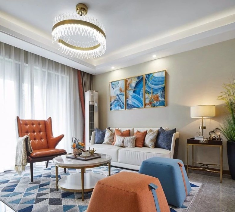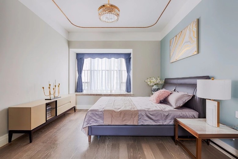 在轻奢风里,像沙发、床铺等大家具,一般是皮艺与布艺的为主,结合上第一点提到的墨绿、深蓝、驼色等组合,可以使得空间更加艳丽活泼。