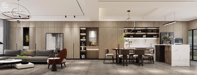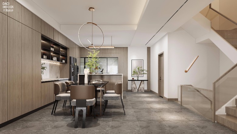 餐厅的设计宗旨时间约轻松,没有过多的修饰,重在收纳,设计了一组柜子,线条流畅时尚的现代灯饰丰富了空间的层次感和美感。