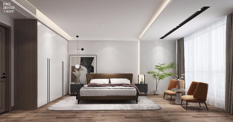 主卧的背景墙设计选用浅色的硬包,整个主卧设计同样以原木,白,灰三色为主,用橘色椅子为房间加入一抹明亮和温暖,靠窗的绿植又为房间注入一丝春意。落地窗设计提升了房间的光线。冬天将至,阳光正好,微风不燥。
