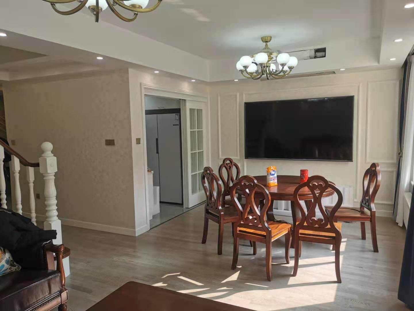 一楼客厅和餐厅在一个空间内,红色木质家具显得非常稳重大气,电视机挂在了餐厅一边,这样以后吃饭时都能追自己的剧集了呢!