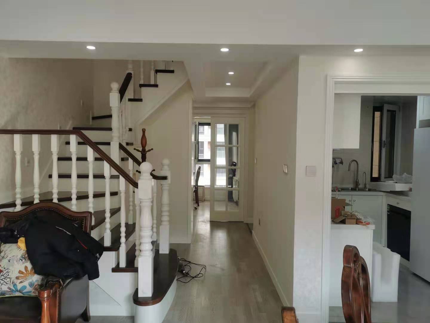 木质楼梯也是很有质感哦。开放式厨房也是非常开阔的,U型布局,更方便操作。