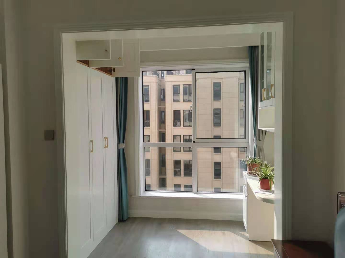 楼上的阳台和房间打通,作为房间的一部分,打制衣柜和梳妆区,显得房间更宽敞了,光线也更好了。的落地窗也非常哦,以后这还能作为房间的休闲区,摆放一个懒人椅,这个冬天就这么暖洋洋的过吧!
