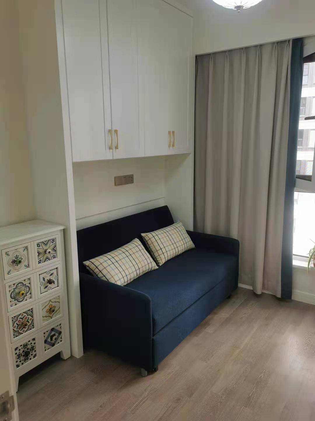 这个小房间放了一个多功能的沙发,满足生活需要。沙发上面做了吊柜,满足小房间面积不够的收纳需要。沙发边上的斗柜,花纹奇特,让人眼前一亮!