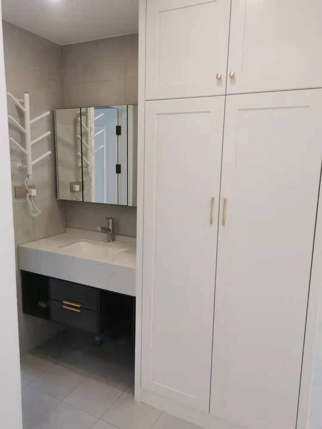 洗手间做了三分离,洗手池外移,让整个干区都能保持清爽,洗手池边上的内嵌橱柜,也起到了很好的收纳辅助。镜面柜也是非常实用,里面可以收纳很多瓶瓶罐罐哦!毛巾架是可以加热的哦,就算在讨厌的梅雨季,也能用到舒适额干毛巾。