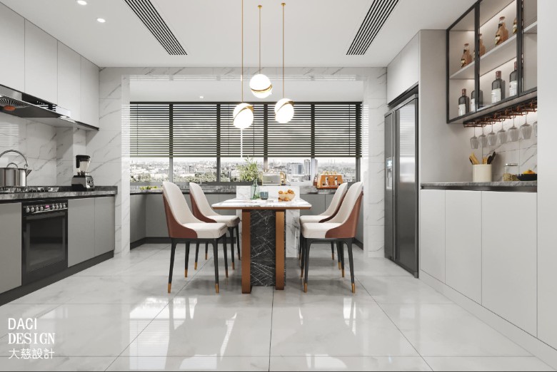 餐厅是当下流行的岛台和餐桌相连的形式,大理石餐桌台面和岛台也能呼应,皮质餐椅很有质感,冰箱做了嵌入式的处理,更加简洁。