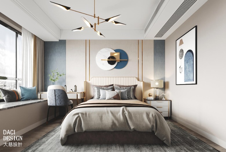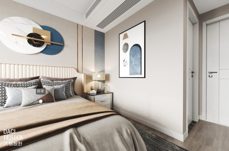 设计师精心挑选的挂画与整屋色调相呼应,只设计了一侧床头柜。