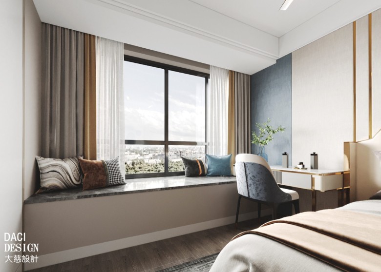 靠窗的床头柜改成书桌,也是梳妆台。飘窗保留并放置靠枕,午后坐在飘窗上晒晒太阳,小憩一会儿也是很惬意的。