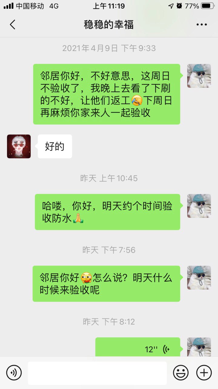 虎皮猫大人:防水本来跟楼下说好今天验收,从昨天开始联系楼下,又失联了,一直到今天早上回复了三句话,总结一下就是没空回来不验收,我去你马勒戈壁的,我真的要被气死了,你从上海来回一趟能要多少时间[表情][图片][图片][attachment=594486 .. (2021-04-18 11:20)