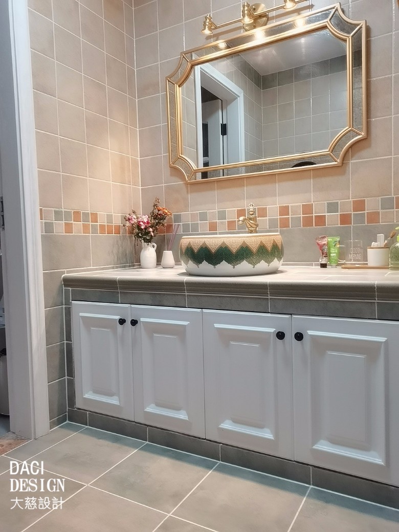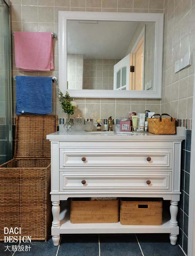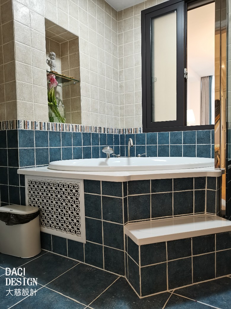 卫浴产品各司其职,整体干净明亮不潮湿,蓝色瓷砖让浴缸空间变得深沉安静。