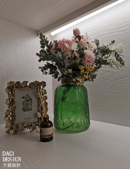 花朵,熏香和银杏叶相框这几件具有生活情调的摆件点缀了空旷的壁柜。