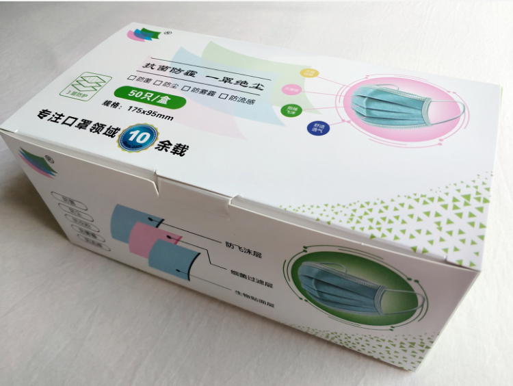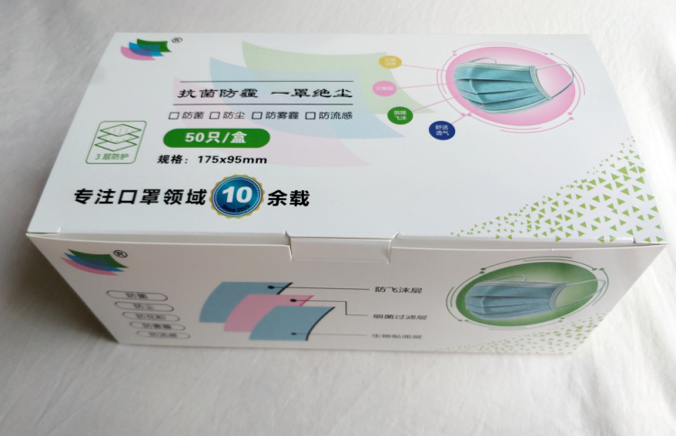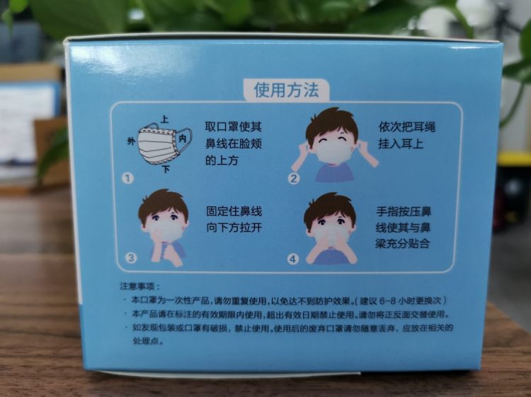 此口罩是3层一次性防护平面口罩,口罩材料为2层无纺布加1层熔喷布,经过臭氧和紫外线照射消毒,能有效阻隔飞沫、粉尘,保护口鼻等作用从而确保身体不受侵害。