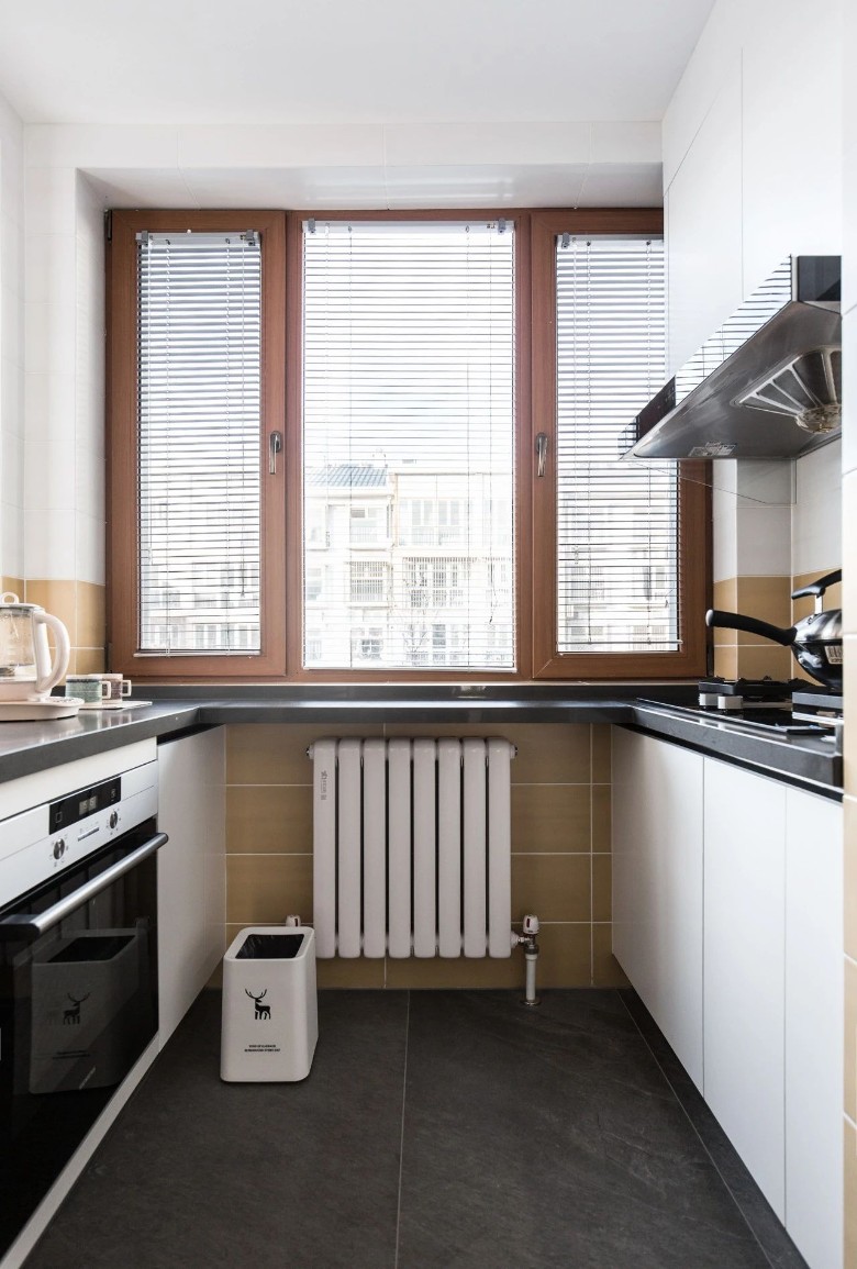 厨房作为加了一个相对紧凑的空间,地面铺设哑光防滑的灰色地砖是非常常见的选择,这样整体地面更加耐脏,设计效果也是非常简约大方。