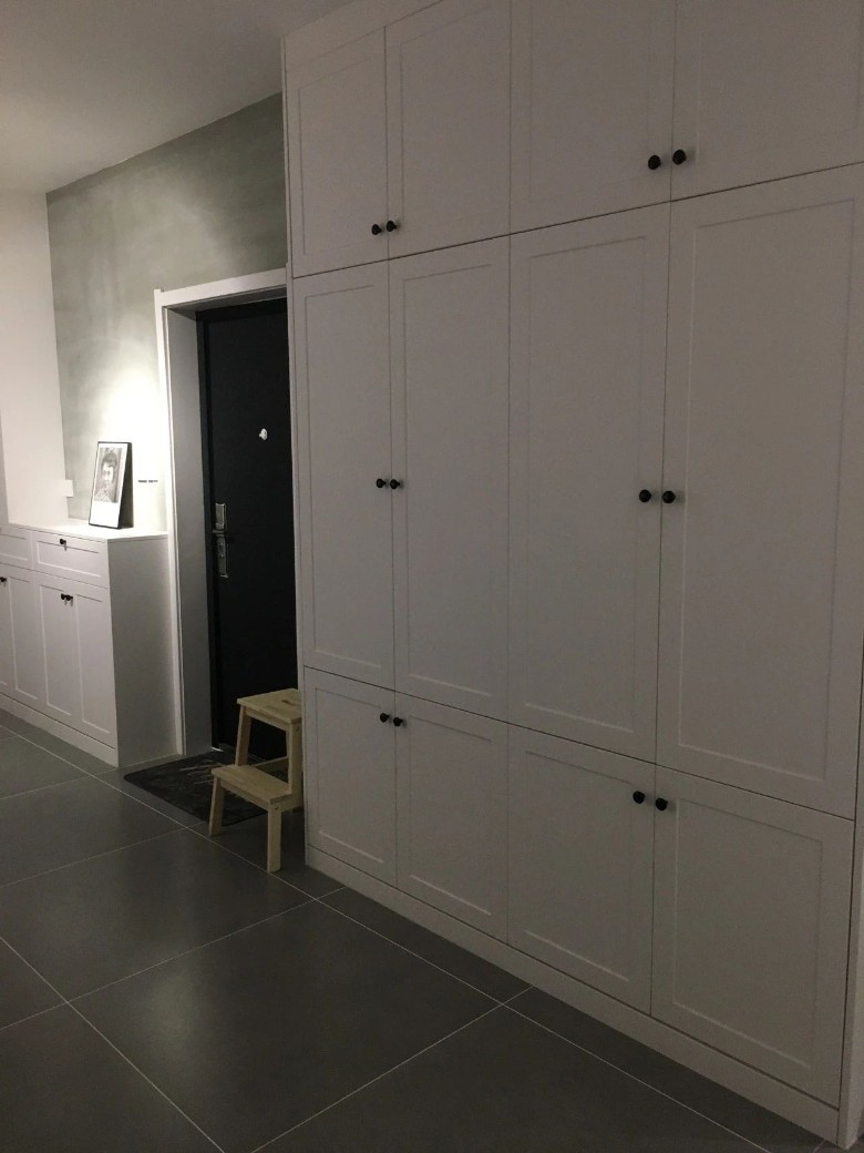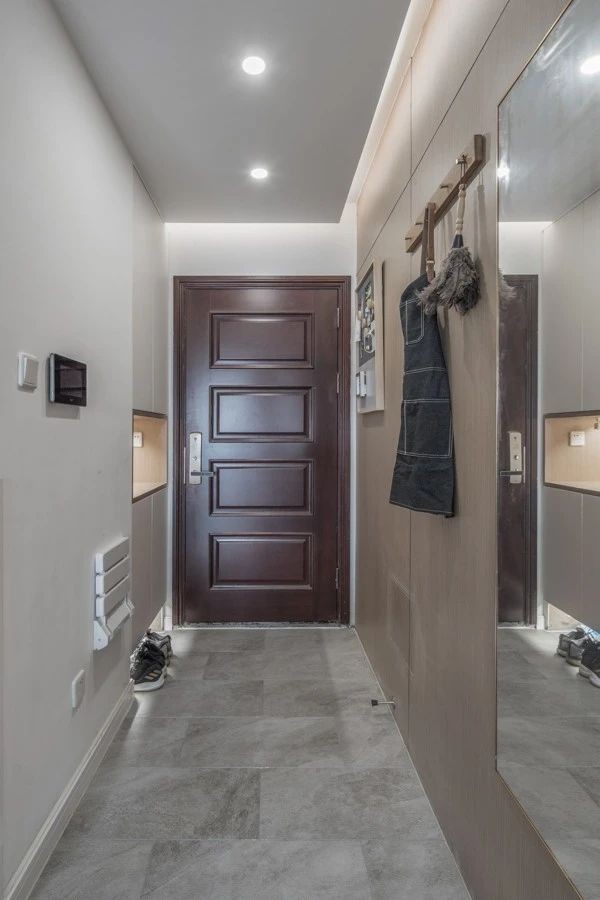 玄关是从室外回家后进入的第一个空间,以灰色地砖铺设玄关的地面,也是可以提供一个耐脏而又简约大方的回家仪式感。