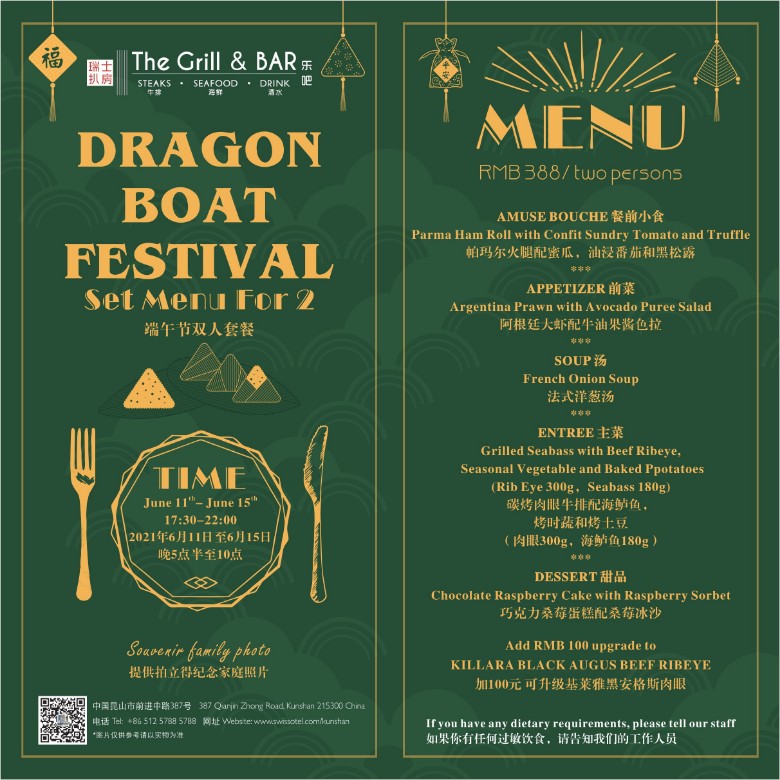除此之外,6月11-15日期间,瑞士扒房还特别为大家准备了端午节双人特色套餐,帕玛尔火腿,阿根廷大虾,碳烤肉眼牛排配海鲈鱼,巧克力桑莓蛋糕等等都是一绝!另加100元更可升级至及进口安格斯肉眼牛排!