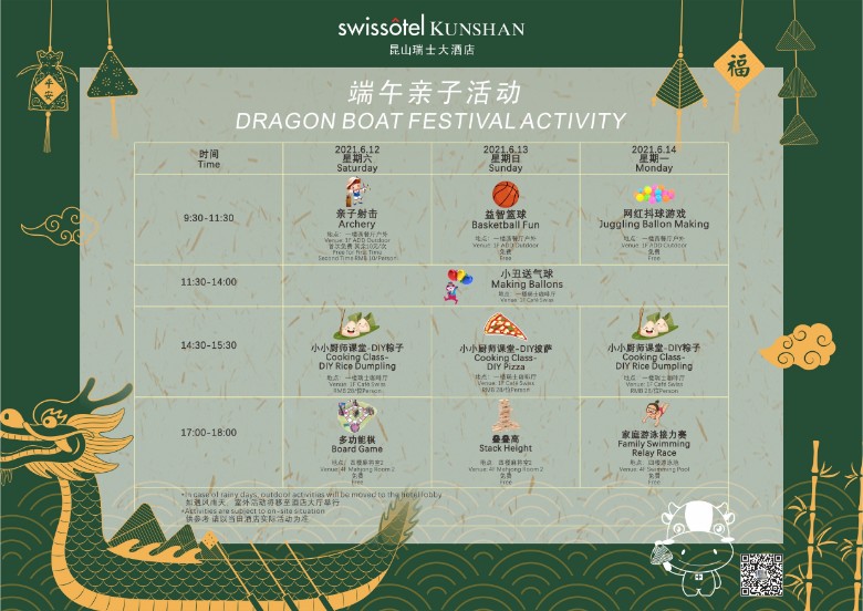 昆山瑞士大酒店为您准备了丰富多彩的亲子活动,亲子射击游戏,小小厨师课堂 - 粽子DIY 披萨DIY, 益智篮球,叠叠高等,不仅培养了小朋友的动手能力,更是加强家庭、同龄小朋友们的交流能力!
